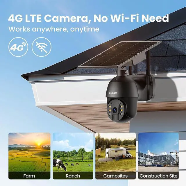 Requires Monthly Data Plan for 4G Cellular Coverage: Soliom S600 4G cellular security camera can work anywhere nationwide with 4G LTE coverage in the US. Suitable for no electrical power such as backyard, garden, campers, trailers, construction site, workplace, warehouse, farms, and ranch etc. 300M data trial. Only support the US local ATT, T-Mobile and Verizon prepaid 4G sim card.