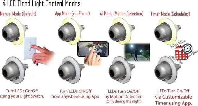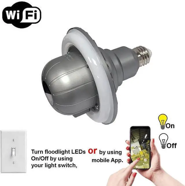 Maintain your original floodlight's indoor on/off power switch functionality plus App & Motion control to the floodlight. Camera sends alerts & records video when motion is detected, Live view & playback via Mobile device.