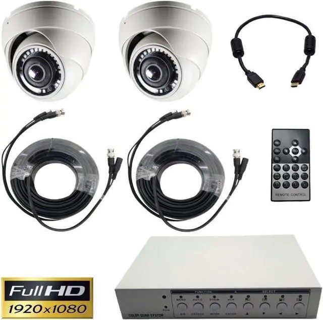 Complete Live Viewing System - This system includes 2 wide-angle dome cameras, a 4-channel video quad processor, 1 HDMI cable, and 2 plug-and-play camera cables.
