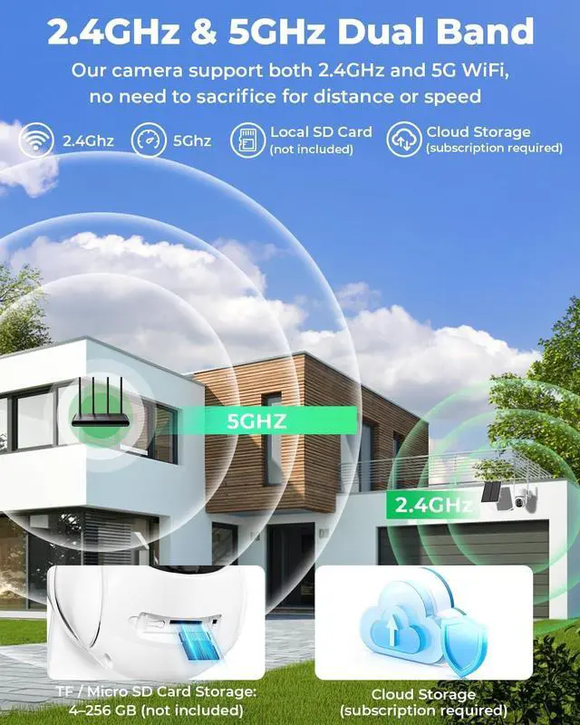 Flexible Storage & Dual-Band Wi-Fi : This solar powered security camera outdoor offers dual storage options: local microSD card (requires separate purchase) and cloud storage. Cloud storage uploads footage to the cloud with no mandatory subscriptionchoose a plan that fits your needs.Dual-band Wi-Fi support delivers versatile connectivity: 2.4GHz provides broader coverage for long-range connections, while 5GHz ensures smooth, high-definition streaming at close range.