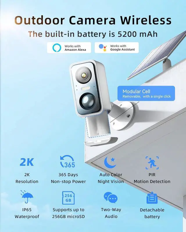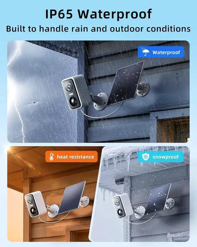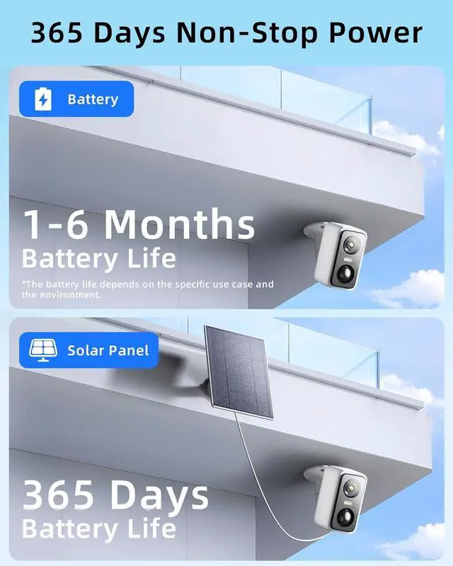 • 24/7 ProtectionSolar-Powered Security Camera: Enjoy nonstop protection with a 100% wireless design powered by sunlight. Say goodbye to dead batteries and messy wiringthis system captures solar energy for dependable performance year-round, even in cloudy conditions.