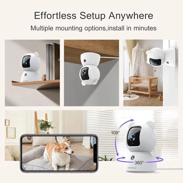 The camera auto-tracks motion across a 360° view and sends instant phone alerts when motion, people, pet or sounds are detected.