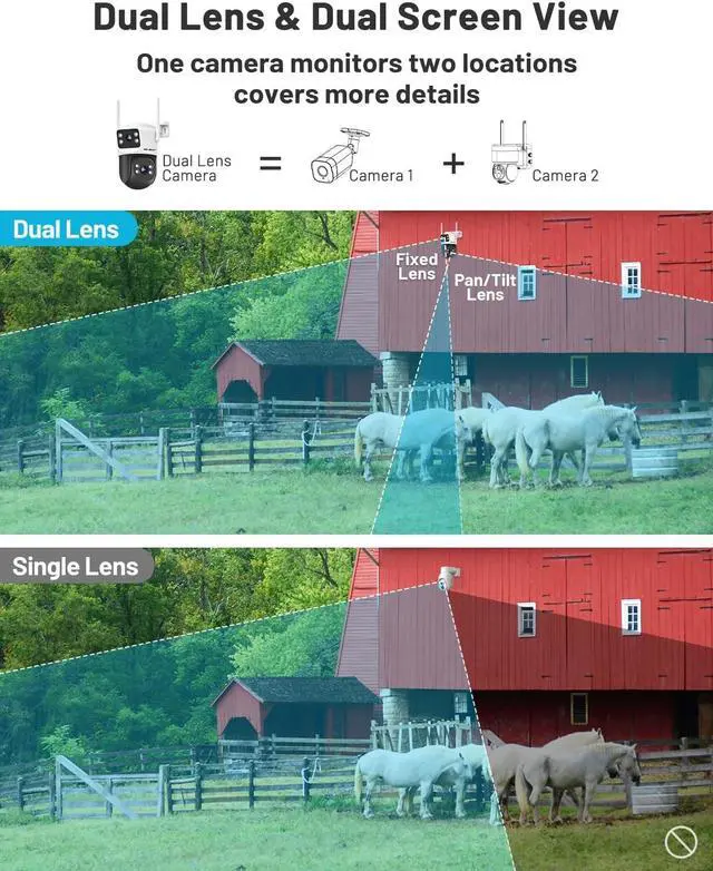 Full-Color Night VisionUnlike traditional black-white IR cameras, this dual lens non wifi security camera captures vivid color footage even in near-total darkness. Perfect for monitoring driveways, ranches, or dimly lit warehouses.