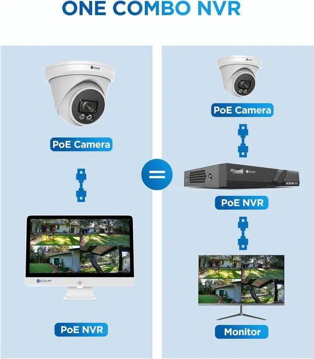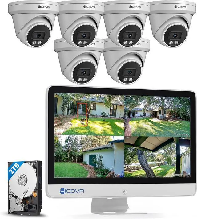 1RECORDING2DAYTIME VISION3NIGHT VISION 4K 8CH NVR with MonitorAll-in-one LCD Combo Recorder, 8 PoE Ports, RJ-45 10M/100M self-adaptive Ethernet InterfaceNetwork Input8CH IPC 4K/6MP/5MP/4MP/1080PVideo Audio OutputHDMI up to 4K, VAG up to 1080pSynchronous Playback8 Channel Synchronous PlaybackStorage CapacityPre-installed 2TB Hard Disk in the NVR, Up to 8TBPower SupplyDC52V/1.8A, Consumption: 10W( without HDD )Work Environment10°C ~ + 55°C ( +14°F ~ +131°F ), Humidity 90%Supported ModesPerson Detection; Motion-Triggered Detection; 24/7 RecordingCamera Specs5 Megapixels - 2592 x 1944Viewing Angle110°Smart AlarmsMotion detection/Person detectionAudioBuilt-in Microphone (10-15ft)Night VisionBlack/WhiteWeatherproofIP67 Metal Housing, Indoors/ OutdoorsPower SupplyPower over Ethernet, Plug & PlayOperating Temperature-20-(+50)/ -4°F ~ 122°F , 10%-90%RH IP67 Durable Weatherproof 110° Wide Vision H.265 Video Compression With or Without Internet 5MP PoE Surveillance Security Camera System Specifications
