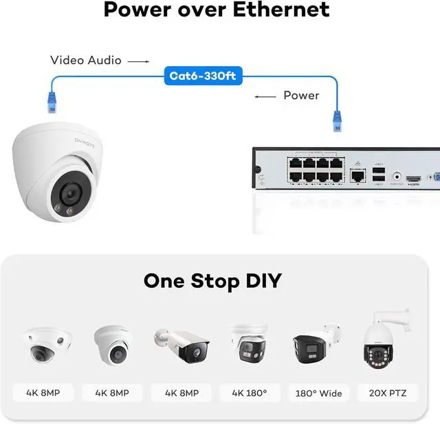 Power over Ethernet, Plug and Play. PoE NVR provides power to cameras via ethernet cables.