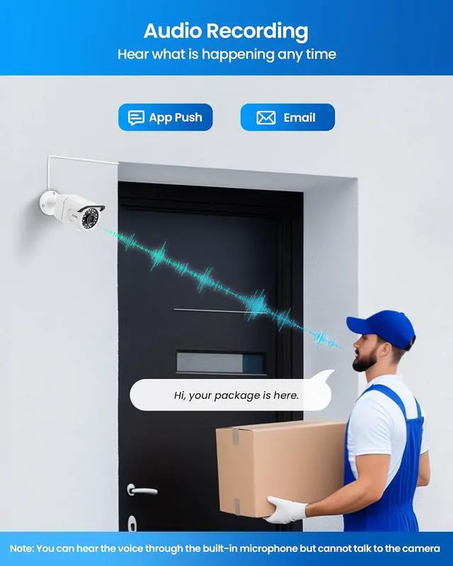 One-Way Audio & Metal Weatherproof Design--The built-in microphone lets you listen in remotely (one-way audio), while the aluminum metal housing ensures IP66-rated weatherproof durability. Ideal for indoor/outdoor use in any conditions.