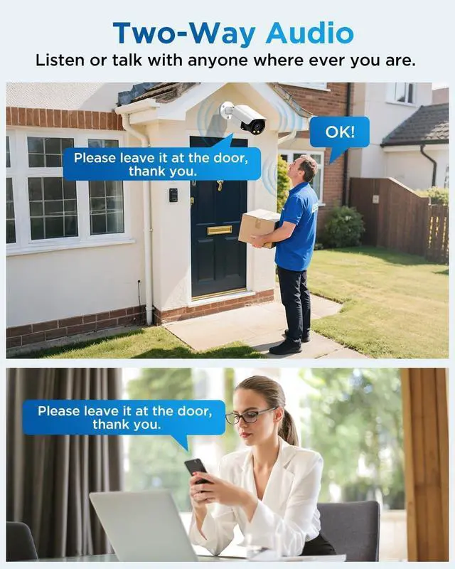 TWO-WAY AUDIO: Built-in Microphone and Speaker in a security camera system allows to listen and speak through the camera. This feature lets you interact with family, visitors, or deter intruders.
