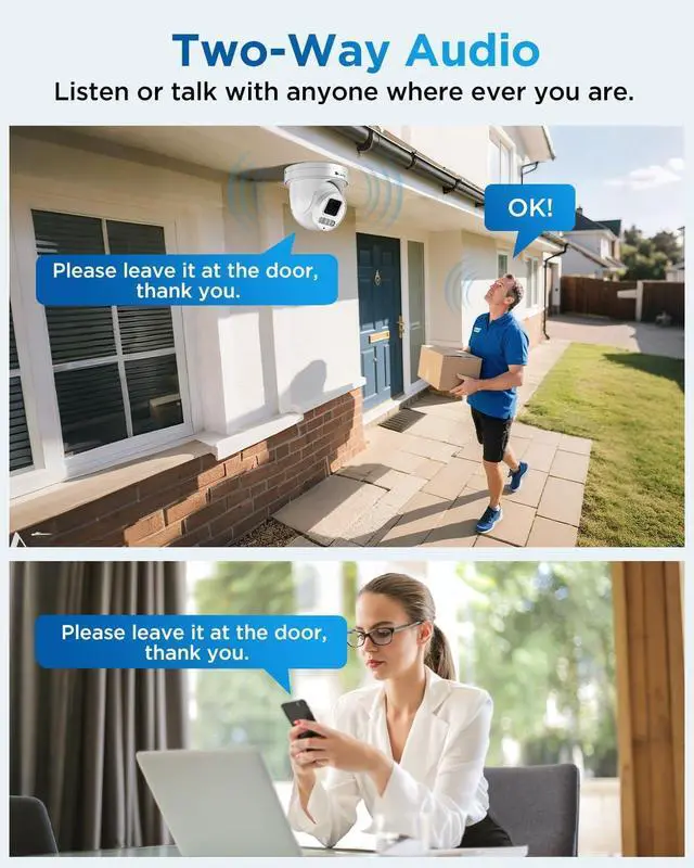 TWO-WAY AUDIO: Built-in Microphone and Speaker in a security camera system allows to listen and speak through the camera. This feature lets you interact with family, visitors, or deter intruders