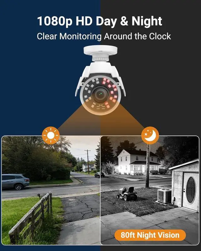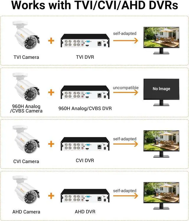 1080P HD-TVI Security CamerasEnjoy crystal-clear footage with 2MP 1080P HD resolution. This bullet surveillance camera supports wide compatibility with 720P, 1080P, 5MP, and 4K HD-TVI/AHD/CVI analog DVRs. Please note: It is NOT compatible with 960H CVBS DVRs, please check your DVR compatibility before purchasing.