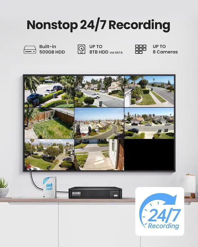 DVR allows local access and centralized management of up to 8 cameras, ensuring effortless control around the clock.