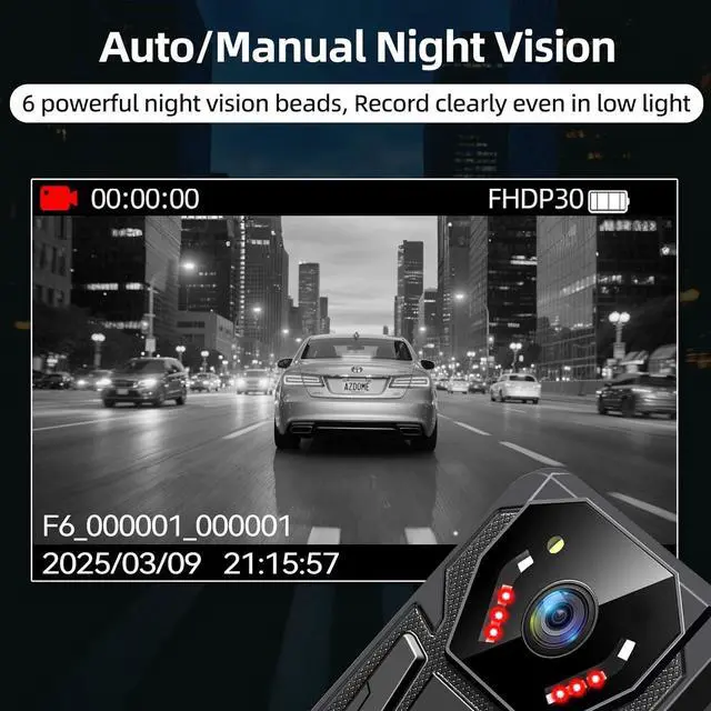 Support Infrared Night Vision Switch and LED Lights Body camera with night vision and equipped with 6 infrared night vision lights, enabling clear image and video capture in dim or low-light comditions within a range of 15 meters/50 feet. You can set the infrared switching mode to auto or manual to suit your needs. In addition, the bodycam camera is equipped with an LED white light, which can provide consistent clarity for in low-light conditions, making it easier for you to record