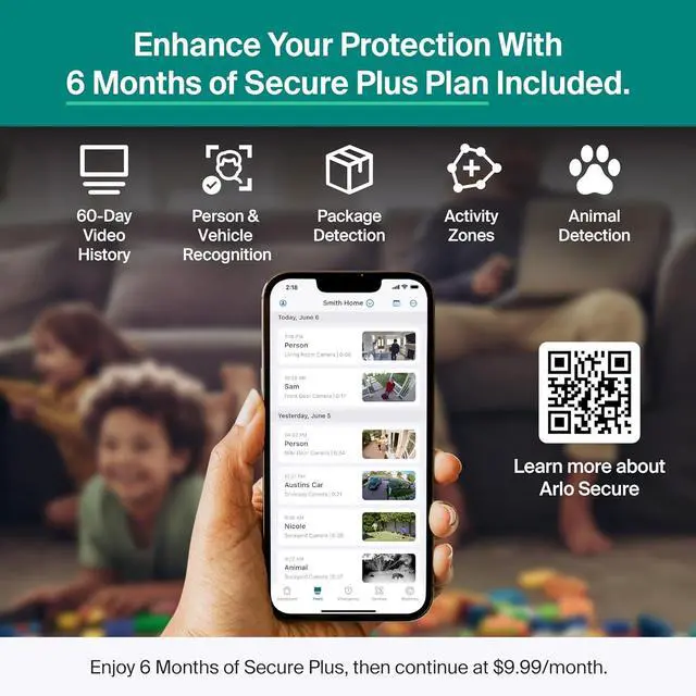 Enhanced Protection with 6 Months of Secure Plus Plan Included: Access 60-Day Video History, Person & Vehicle Recognition, Package Detection, Audio Detection, Activity Zones & more. After trial, subscription plans start at $17.99/month (billed annually).