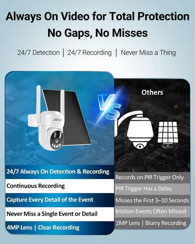 1Safeguard Your Property2Remote Monitoring3Color Night Vision44MP AntiFog Lens124/7 Recording2Cloud Storage3Forever Solar Power4Customized Detection Zone View up to 16 cameras simultaneously on a single smartphone or tablet screen, and easily manage multiple sites with unlimited camera groups.
