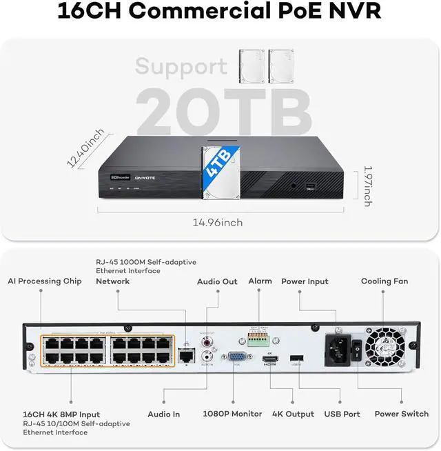 16CH 12MP NVR-- Built-in 4TB HDD, 2 HDD ports support 20TB.