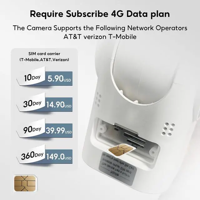 Built-in SIM CardIncludes an 4G LTE SIM card (U.S. only; AT&T, T-Mobile, Verizon) with a 7-day unlimited trial. Only the built-in SIM supports operation; after the trial, a subscription must be made ($14.9/month$149.9/year) to continue cellular service. Please ensure the installation site has 4G coverage. Flexible Local Storage with MicroSD, No Subscription Required, Support card up to 128GB (sold separately).