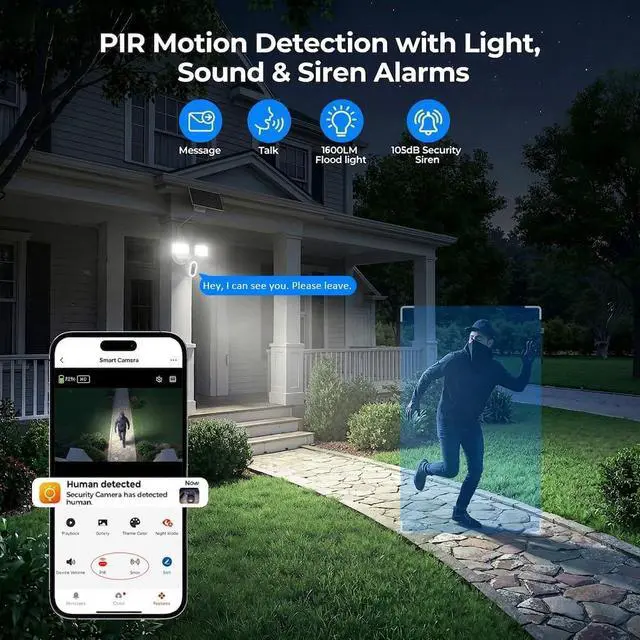 PIR Motion Detection, 2-Way Talk & Siren: Built with PIR human detection to identify real human movement and help reduce unnecessary alerts. When motion is detected, the light turns on automatically, and youll receive instant app alerts. Use 2-way audio for real-time communication and activate the siren for added security.