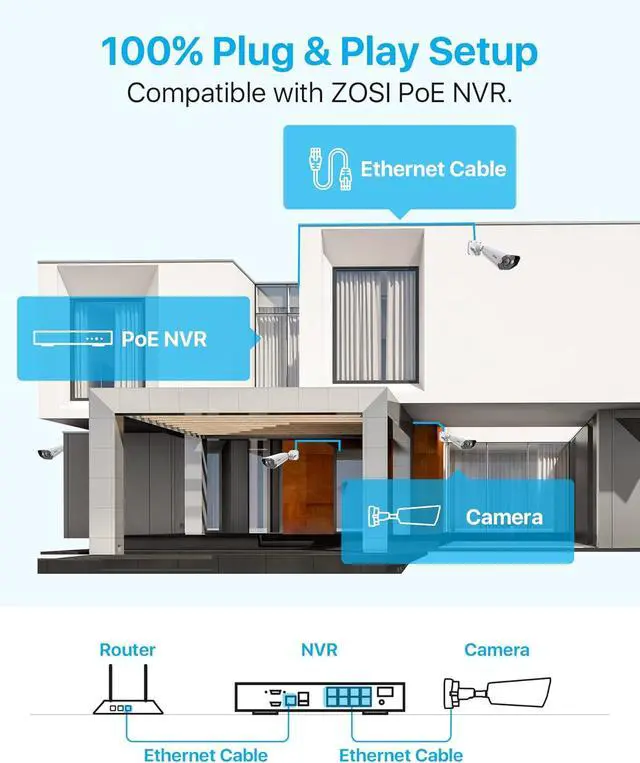 NotedThis PoE cam could only work with the ZOSI PoE NVR. This IP camera does not come with an ethernet cable.