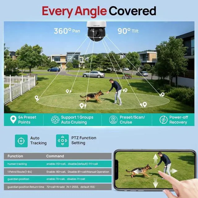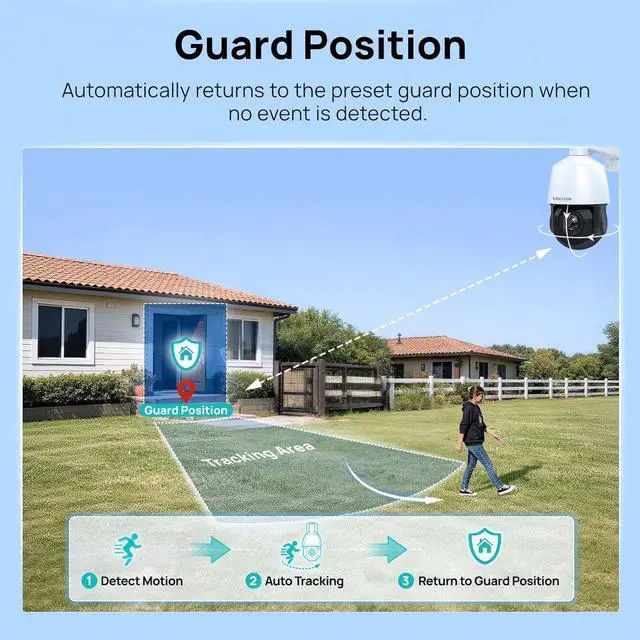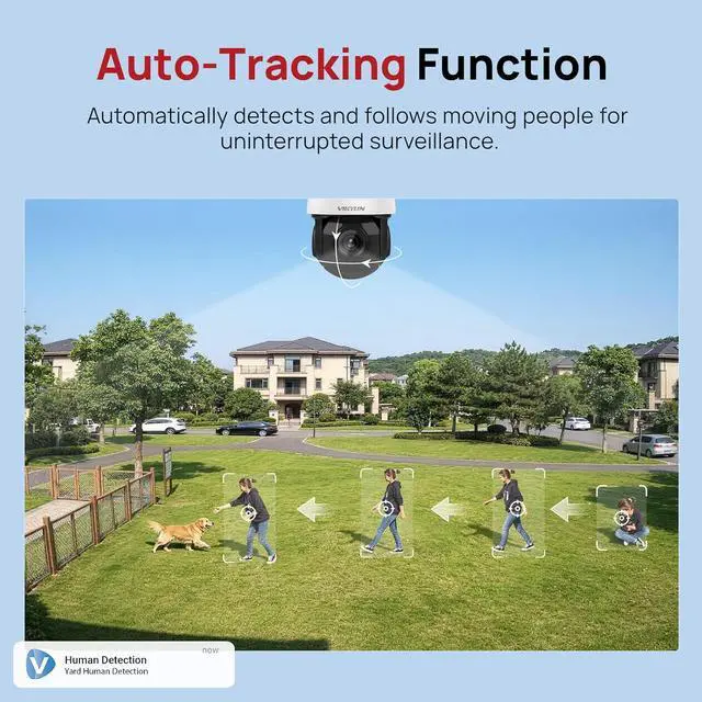 PTZ CAMERA WITH AUTO TRACKING AND ZOOM Monitor wide areas with 360° pan and 90° tilt coverage. The powerful 25X zoom captures distant details, while auto tracking follows moving people automatically. Support 1 groups of cruising routes, each route can be set to 64 preset positions. Kindly remind: please enable auto tracking and patrol routine functions when needed.
