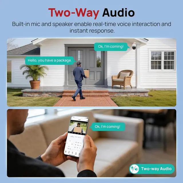 SMART HUMAN DETECTION WITH INSTANT ALERTS AI detection identifies human movement and sends alerts through app notifications, email, and audible alarm. With built-in two-way audio, you can communicate directly through the camera to warn intruders or talk with visitors from anywhere.