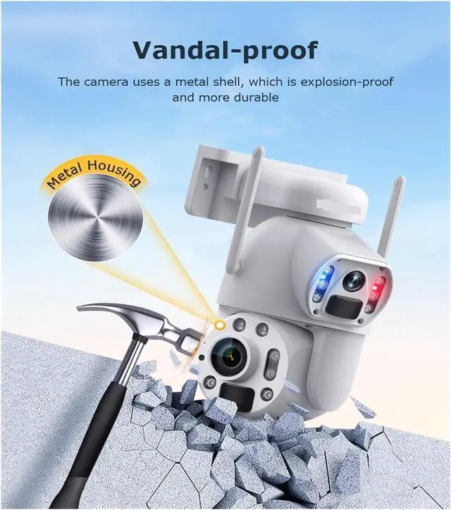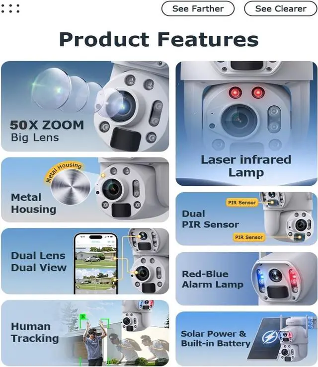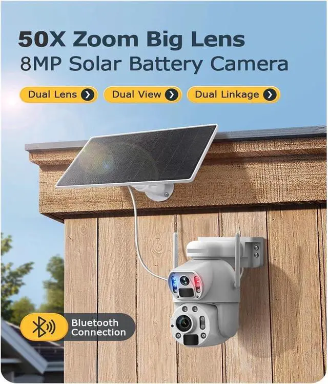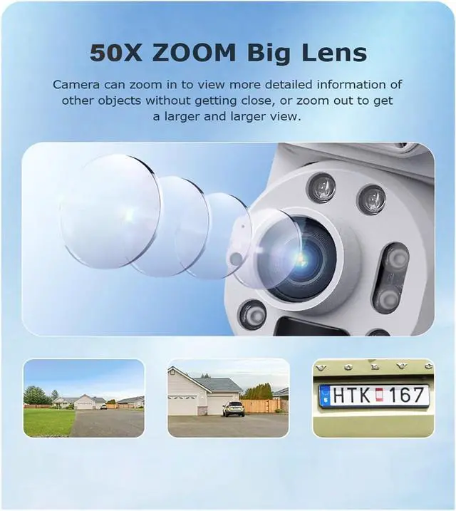 Features a powerful 50X zoom lens and dual-view design for wide-area monitoring and detailed close-ups. The function allows 350° pan and tilt, and human auto-tracking keeps moving subjects in focus.