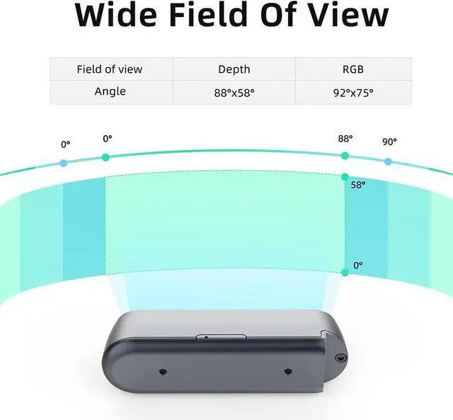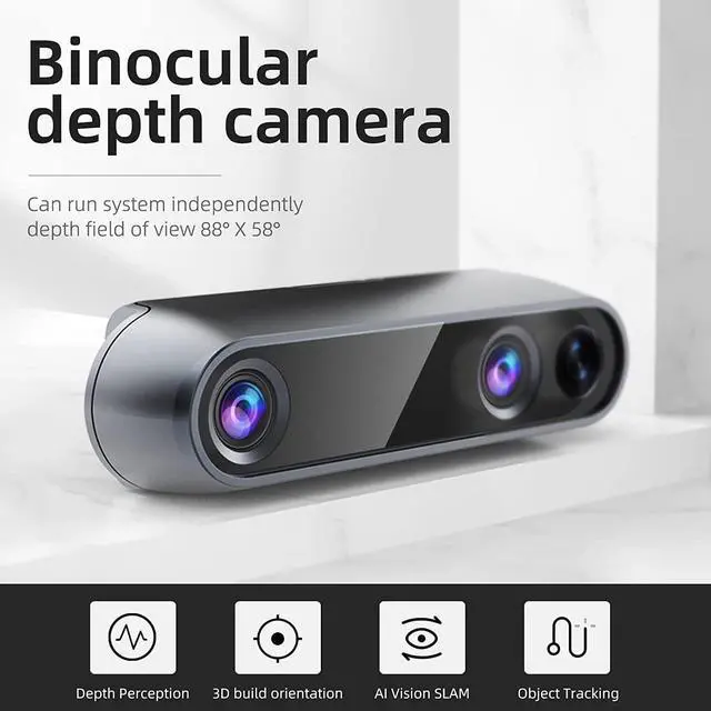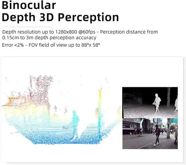 Powerful 3D depth perception engine: The depth camera resolution can reach 1280 x 800 @60fps; the perception distance is from 0.15cm to 3m; the perception accuracy error is <2%; the field of view can reach 88°x 58°. The RGB camera resolution is 1600x1200, field of view 90°x 73°.