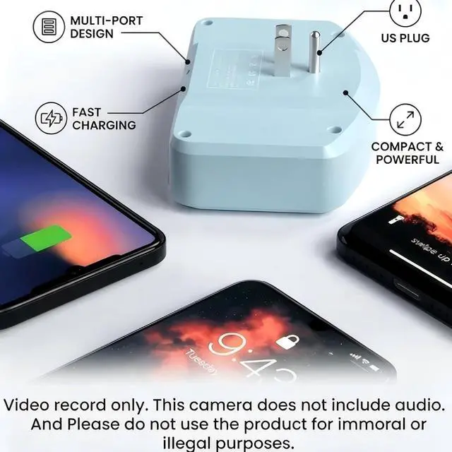 2026 upgraded 4-in-1 wall outlet camera with 4 AC outlets, 3 USB PD fast charging ports, 1700J surge protection, and a hidden cam. Flame-retardant & heat-resistant up to 248°F. Not for high-power devices.
