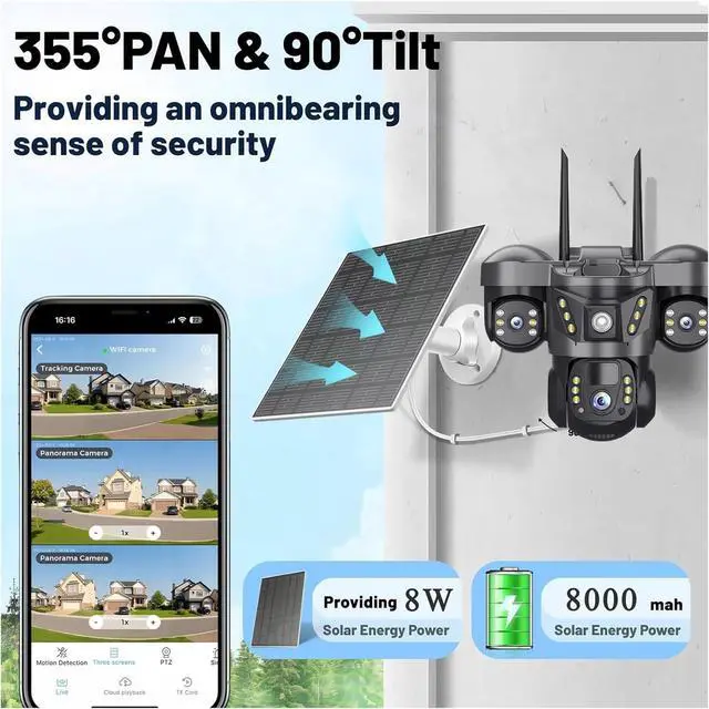 15 million pixels (5MP+5MP+5MP) triple-lens design with 10x digital zoom and 180° viewing angle, delivering 1080P full HD footage, capturing all-around details without blind spots for indoor and outdoor surveillance.