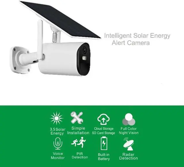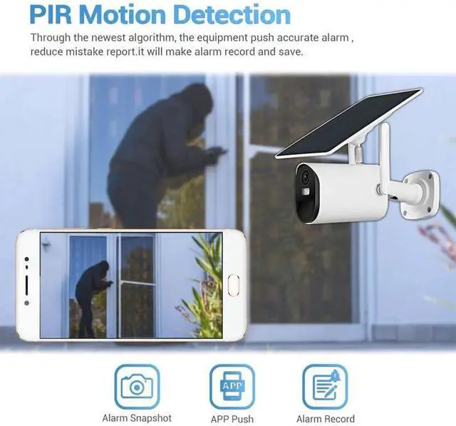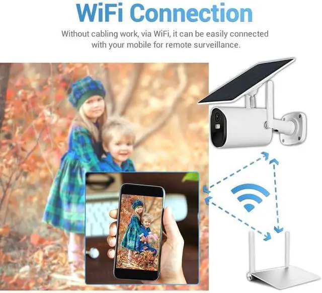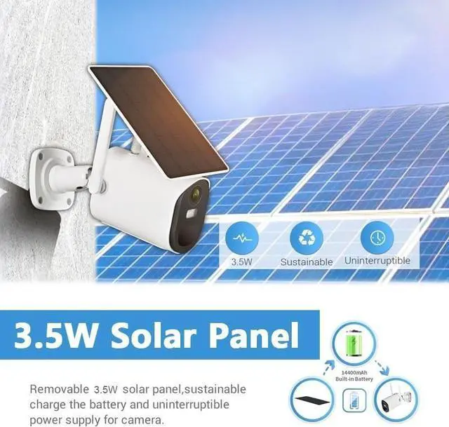 100% Wire-Free Solar Power & Large BatteryNo more frequent charging or messy wires! The solar security camera is equipped with an efficient solar panel and a built-in rechargeable battery, providing non-stop power for 24/7 surveillance. Even in low-light conditions, the solar panel continuously harvests energy to keep the camera running. The completely wire-free design allows you to install it anywhere outdoors, perfect for yards, garages, farms