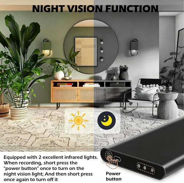 1080P Full HD & Superior Night Vision This mini hidden camera captures sharp 1080P FHD video and clear images with a wide-angle lens. Built-in infrared lights ensure crisp recording even in low-light or dark environments, providing reliable 24-hour monitoring for your home and space.