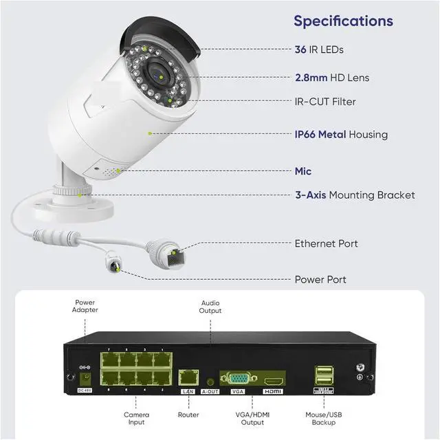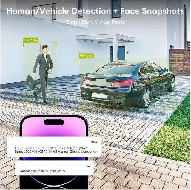• The 8CH 8MP Wired NVR POE Security Camera System offers 8MP ultra HD resolution for sharper picture quality and richer detail than traditional 720p or 1080p surveillance systems. Whether it's recognizing faces, license plate numbers, or catching small objects moving, you can do it with ease. It is especially suitable for places requiring high-precision monitoring, such as gate entrances, parking lots, etc.