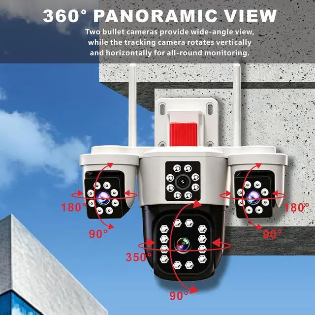 360° Panoramic View: Two bullet cameras provide wide-angle view, while the tracking camera rotates vertically and horizontally for all-round monitoring. It can guard three different areas simultaneously and supports multiple preset positions.