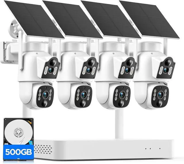 DUAL LENS = 8 SCREENS: 4 Cameras Show Twice the Views Each of our 4 solar powered security cameras features dual lenses that's 8 total live views covering your property. No blind spots, no gaps. Unlike single-lens competitors, our dual lens outdoor security cameras capture front AND side simultaneously. 10-channel NVR system supports up to 10 cameras for unlimited expansion. Home security cameras system that truly sees everything.