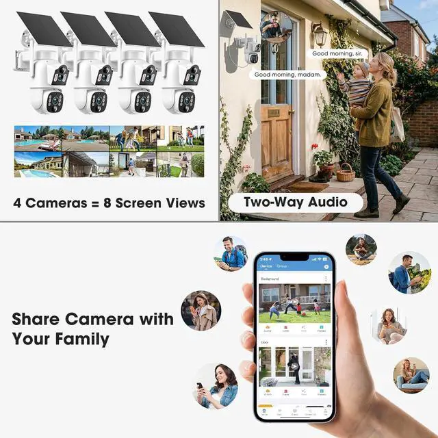 Solar Powered & Wireless Truly Wire-Free Outdoor Security No wiring headaches. Our solar security cameras wireless outdoor system harnesses sunlight to keep cameras running 24/7. The 2.4/5.8GHz dual-band WiFi ensures stable connectivity for every camera. Wire-free installation takes under 30 minutes. Solar powered security camera outdoor kits that never stop protecting your home rain or shine. Compatible with Alexa.
