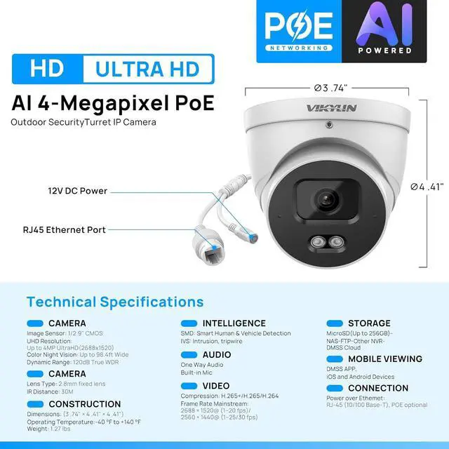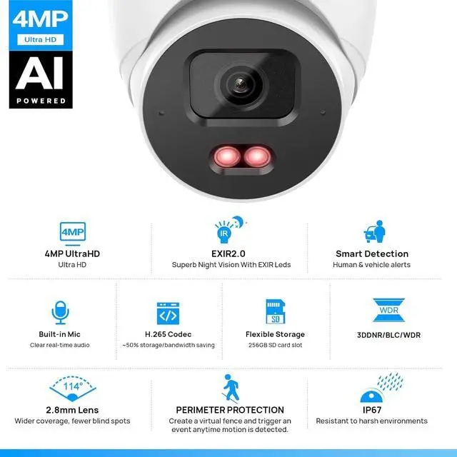 Ultra HD Starlight 4MP Resolution Security PoE IP Camera- This 4mp poe camera with Ultra HD Resolution & 1/2.9'' Starlight Low-light CMOS Sensor extremely clear picture both in daylight and at night. The 2 pcs array IR Leds, advanced EXIR 2.0 Night Vision tech, 120 dB true WDR & 3D DNR, all enable the 4mp ip camera to deliver the sharpest images at 2688x1520@25fps pixels both day & night. Protects your home and business day & night.