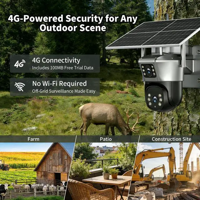 4G Outdoor Camera Works Without WiFi Equipped with 4G cellular connectivity and built-in VSIM (100MB trial data), the outdoor camera ensures stable monitoring even in areas without WiFi, such as farms, construction sites, or vacation homes.