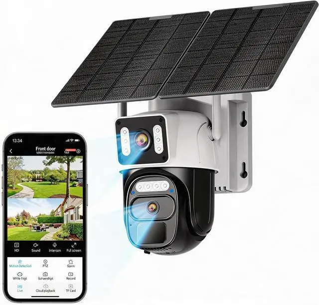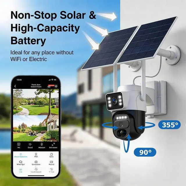 Dual Lens & 355° Panoramic PTZThe dual-lens design offers dual-screen viewing, covering both wide-area and close-up views to reduce blind spots. The PTZ supports 355° pan and 90° tilt, remotely adjustable via the app. Delivers 1080P HD video, dual light sources, and 10m color night vision.