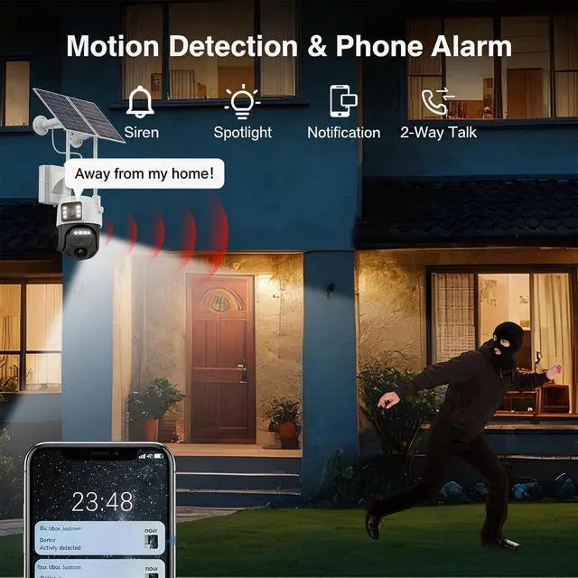 Smart Detection & Real-Time AlertsPIR and AI recognition detect people, pets, and vehicles while reducing false alarms from insects, leaves, etc. Supports audible/visual alarms, push notifications, and two-way audio for remote communication or deterrence.
