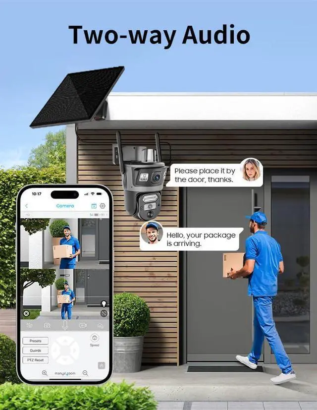 Intelligent AI human detection and color night vision. Advanced artificial intelligence algorithms can accurately detect human motion, recognize accurately, and greatly reduce false alarms. The camera also has color night vision function, using powerful infrared LEDs and sensitive sensors to provide vivid, full-color lenses even in complete darkness. This ensures clear identification at any time, day or night