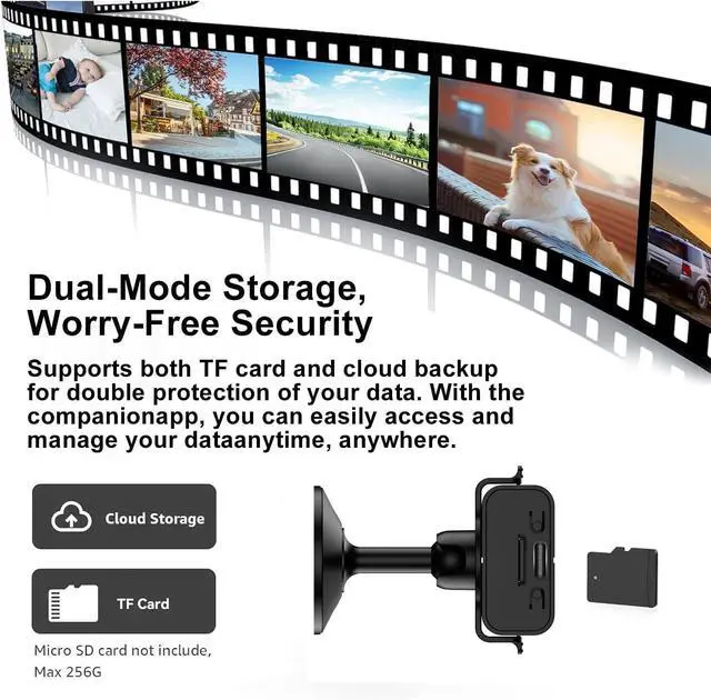 Dual Storage: Local & Cloud Options. Flexibly record via SD card (supports 256GB) for continuous 24/7 footage or secure critical moments with encrypted cloud storage. Includes a 7-day free cloud trial.