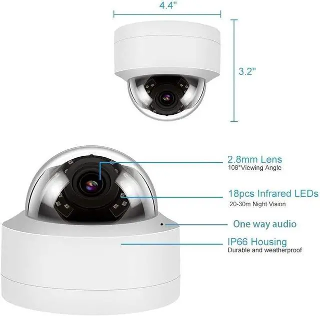 WIDE ANGLE & POWERFUL NIGHT VISION: Monitor large areas with a 100° field of view provided by the fixed 2.8mm lens. Advanced IR LEDs automatically activate in low light to provide clear, sharp black-and-white video with an impressive 65ft infrared night vision range.