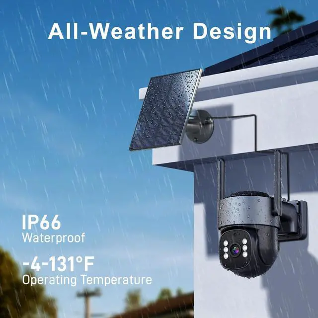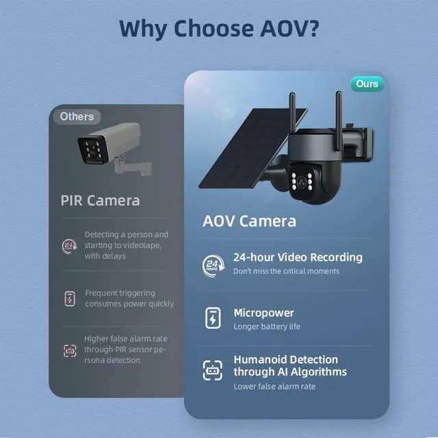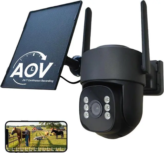 Solar Powered & Smart AOV RecordingFeaturing a 7W solar panel and a built-in 9000mAh rechargeable battery, this solar security camera truly runs off-grid. The unique AOV recording system captures motion at 15 fps and switches to low-power 1 fps (customizable) during inactivitycutting power use by up to 90% and allowing continuous operation for nearly a month