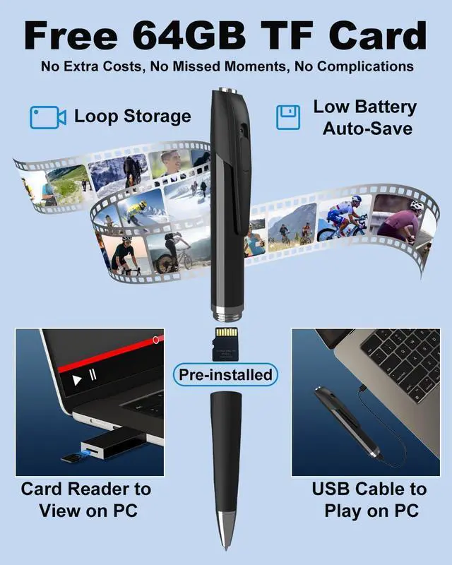 64GB Memory Card Included & Easy File Saving The hidden camera pen comes with a pre-installed 64GB memory card and supports up to 128GB microSD cards. Whether you use it as a spy pen or camera pen, your files are automatically saved and ready for quick transfer via USB cable or card reader.
