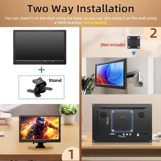 [Portability & Installation Design]: The monitor screen and stand are detachable, with the stand offering angle adjustment and screen rotation. Slim and compact, it fits easily into a handbag for hassle-free portability. Its VESA 75x75 wall-mount compatible (mounting bracket/screws sold separately), making it ideal for desktop use, embedded setups, or in-vehicle installationall while saving valuable space
