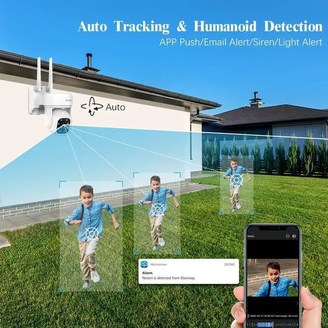 {Wireless Security Camera System} This WiFi security camera system includes a 10-channel NVR and wireless outdoor cameras, providing reliable home surveillance without running long network cables. Perfect for monitoring homes, offices, garages, warehouses, and businesses. {350° Pan, 90° Tilt & Auto Tracking} The PTZ security camera supports 350° horizontal pan and 90° vertical tilt, delivering wide-area coverage with minimal blind spots. The built-in AI auto-tracking feature automatically follows moving people to keep them within the camera view. {130° Wide-Angle Viewing} The camera features a 130° ultra-wide-angle lens, providing broader coverage for outdoor areas such as yards, driveways, and parking spaces while reducing surveillance blind spots. {Dual Antennas for Stronger WiFi Signal} Each camera is equipped with dual high-gain antennas, increasing wireless transmission distance by up to 55%. This helps maintain a more stable signal and smoother video compared with standard single-antenna cameras. {Two-Way Audio & Free Remote App} The cameras include a built-in microphone and speaker for real-time two-way audio communication. Use the free Honestview app on iOS, Android, tablet, or PC to access live view, playback, and remote monitoring anytime with no monthly subscription fees.