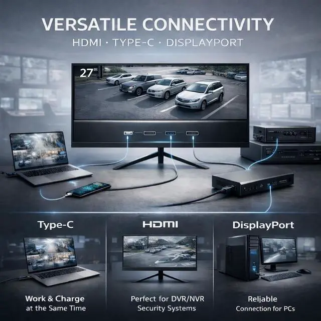 VERSATILE CONNECTIVITY HDMI 2.1, DISPLAYPORT 1.4 & TYPE-C 65W Equipped with HDMI 2.1 (up to 4K@60Hz), DisplayPort 1.4, and USB Type-C with 65W Power Delivery for single-cable laptop charging and video. Seamlessly connects to NVRs, DVRs, PCs, and modern laptops without extra adapters the only monitor in its class offering all three premium inputs.