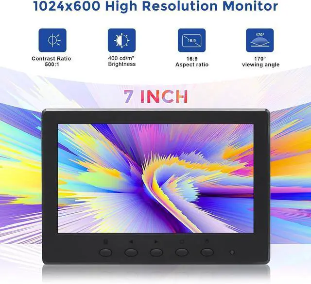 Small Portable PC Monitor7 inch IPS monitor with LCD screen, HD 1024*600 high resolution super slim design. This monitor with 170° wide-angle, 400 cd/m², 16:9 aspect ratio, the 7 inch small monitor delivers a vivid, bright saturation image,giving you clear and rich color visual experience.