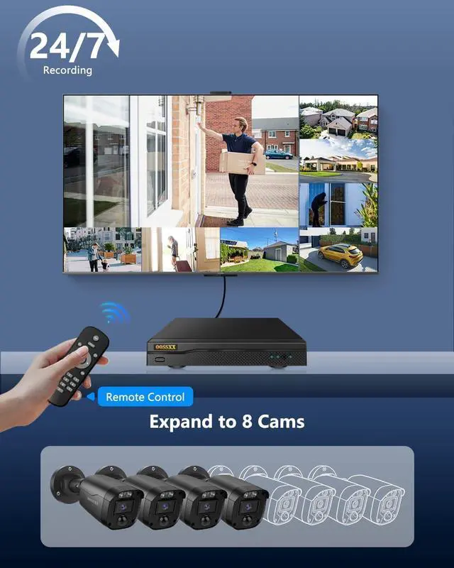 {122° Ultra Wide-Angle Lens Equipped} Optical wide-angle lens with multi-layer lens, provides you about 122° wide viewing angle and reduces dead ends of surveillance areas. {Full HD 5.0MP High Definition} The 5.0 Mega Pixel (2592 x 1944) High-Definition security camera ensures the more safety of people and homes for 24/7 hours. Everything within 80 feet can be seen even at night. It is equipped with an IR-LED system, automatically activates the infrared mode in low lighting conditions. {IP67 Waterproof Weather Resistance} Designed to withstand harsh weather conditions, the durable security camera system boasts IP67-rated waterproofing, allowing for reliable indoor and outdoor use regardless of the weather. With a top-quality ABS housing, this outside camera is built to endure extreme weather conditions from -40°C/-40°F to 60°C/140°F, ensuring their longevity and reliable performance. {Super Night Vision} Embrace a new era of clarity with the OOSSXX outdoor cameras. Equipped with a high-resolution 5MP sensor and an IR cut filter, this security camera deliver unmatched visuals day and night. Enjoy a 80ft night vision range and an expansive 130° viewing angle, ensuring comprehensive coverage around the clock. {Free App No Month Fee} Download the "Honestview" app for this outdoor security camera from your device's app store to enjoy remote video access. Playback significant footage easily by searching through different days, hours, or minutes. with internet connectivity on this home camera system, you can view live videos from anywhere on your smartphone, tablet, or PC, ensuring you stay always connected.