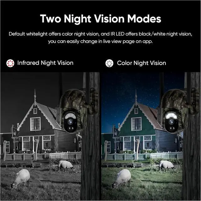 Color Night Vision & Dual Power SupplyUnlike traditional black-and-white night vision, this solar powered security camera features vivid color night vision, presenting clear and colorful footage even in low-light environments. It combines solar panel and rechargeable battery power, no need to connect to outdoor power outlets, ensuring continuous power supply and solving the trouble of frequent charging.