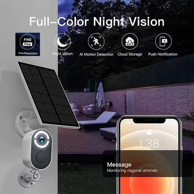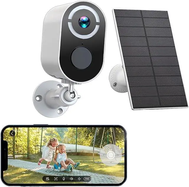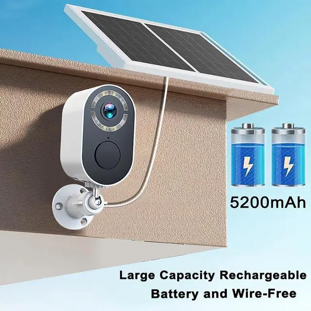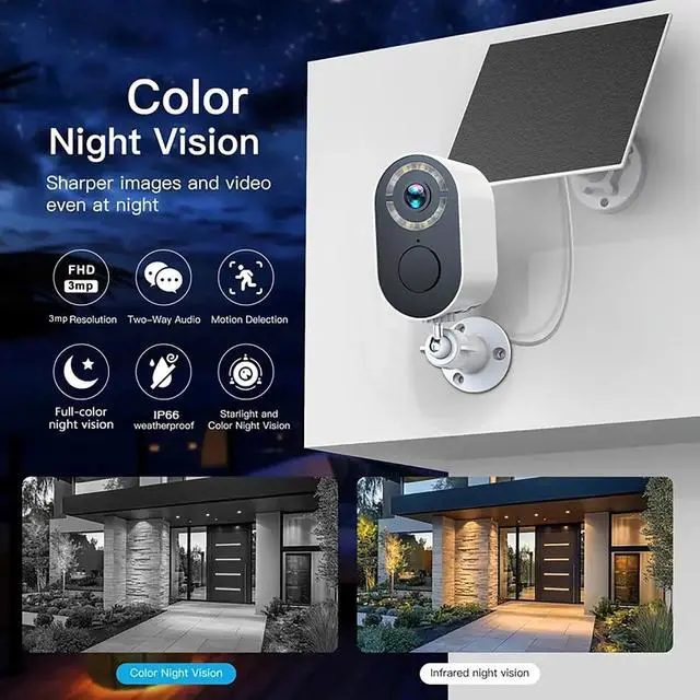 Enhance your home security with this advanced 4MP QHD solar-powered security camera system. Featuring crystal-clear 2K color night vision technology, this camera delivers sharp images and video footage even in complete darkness. The built-in AI-powered PIR motion detection system intelligently identifies human movement, sending instant push notifications to your smartphone. Stay connected with two-way audio communication, while the IP66 weatherproof rating ensures reliable performance in any outdoor conditions. The solar panel provides continuous power, eliminating the need for frequent battery changes. With AWS cloud storage capabilities, you can securely save and access your footage anytime. The camera supports 2.4GHz WiFi networks and includes features like starlight vision technology for superior low-light performance. Perfect for monitoring your property's entrance, backyard, or any indoor space, this camera combines sophisticated surveillance features with user-friendly operation. The sleek, modern design includes an adjustable mount for optimal positioning and coverage of your desired monitoring area.