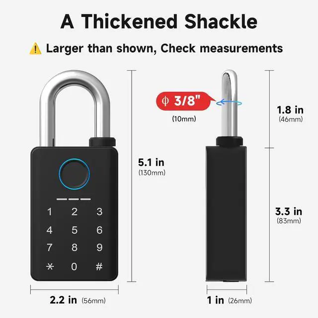 Sturdy & DurableThis heavy-duty smart padlock pairs a corrosion-resistant zinc-alloy body that blocks rust and cracks with a 0.39" (10 mm) hardened stainless-steel shackle rated to survive 15 kN cutting, 5 kN pulling and 100 Nm twisting forcesmaking it tamper-proof.